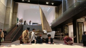 (写真:展覧会「関野吉晴ワンダースペース」@武蔵野美術大学:美術館に展示された縄文号と、ずらっと並んだ関野さんの著書を読む人たち,2018.10.15~11.10)
