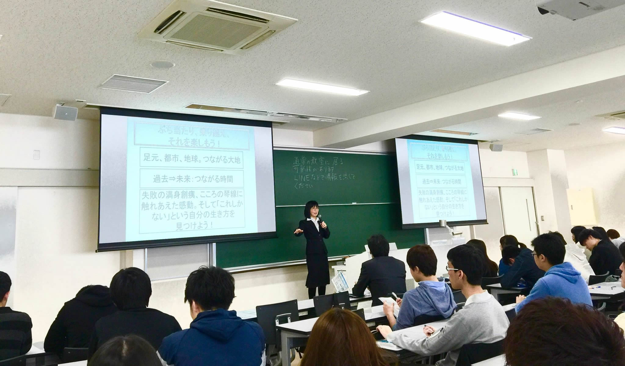 2016年4月には創設されたばかりの「都市創造学部」から「新入生全員に向けて、まちづくりの経験を話してください。現場体験学習へと導いてください」と依頼がきました。