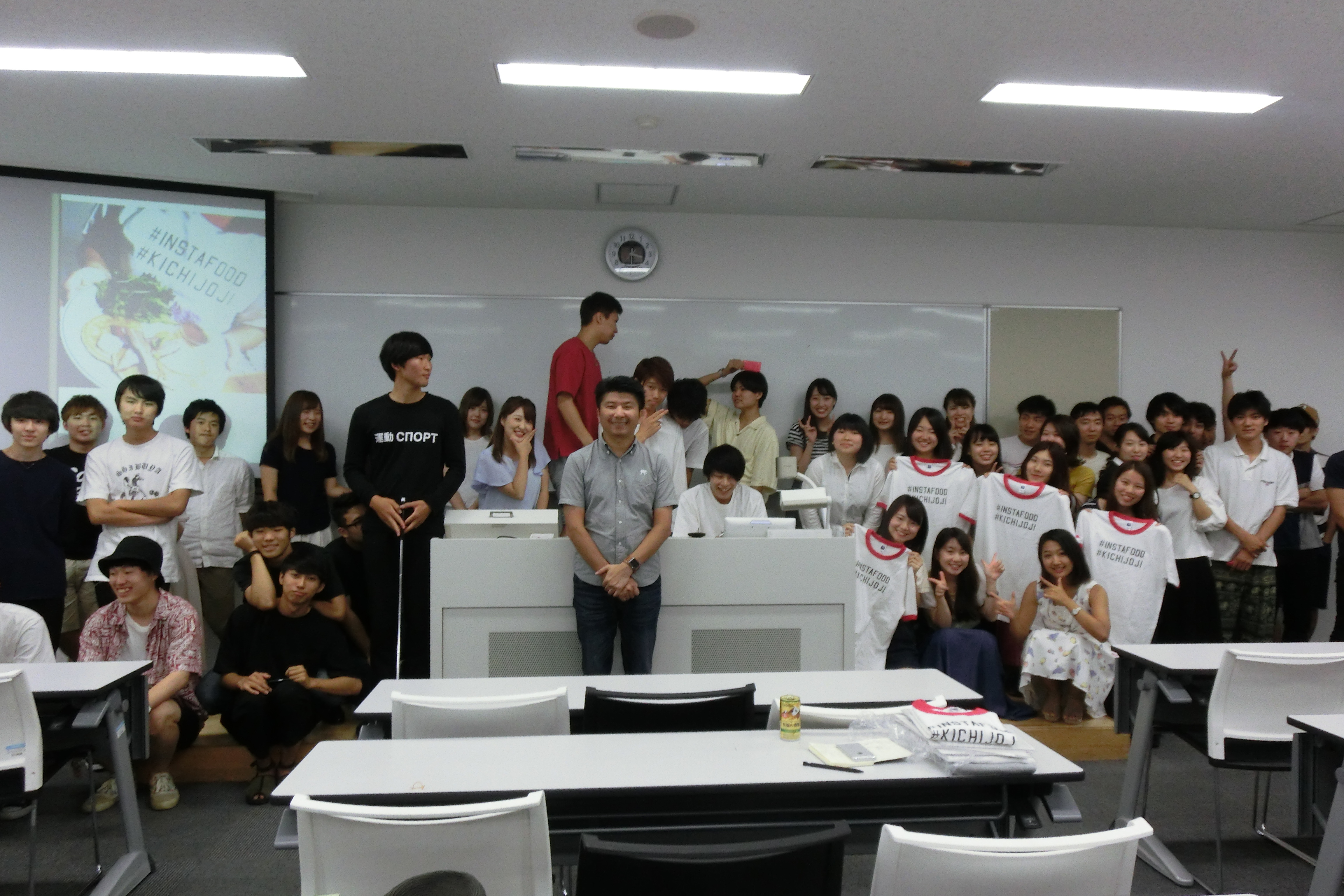 吉祥寺のTシャツ製造小売業P&M代表、Tシャツデザイナーの菊竹進氏(象の「はなこさんTシャツ」生みの親、と言えば知っているヒトもいるでしょうね)に授業ご協力いただき、学生×Tシャツ屋さんの協働。学生はチームに分かれて吉祥寺探索。その経験からのデザイン提案で、吉祥寺Tシャツづくりの試み。写真は、2017年7月、前期最終授業の終了時。学生のアイデアは「吉祥寺のインスタ映えする食べ物を、Tシャツ購入者がみんなで着て、流行のインスタグラムで投稿して、吉祥寺を盛り上げる“吉祥寺インスタTシャッ”」。これができた直後です。胸には#(ハッシュタグ)INSTAFOOD KICHIJOJIのロゴ。あとは投稿者がおいしいものを待って自由に遊ぼう!という仕掛け。菊竹さんをまんなかに教室で撮りました。「やったね!」の笑顔の一枚ですね。活用場面は学生が実際に投稿した画面をネットからプロジェクターに映写してますのでご覧ください。学生のSNS活用力はすごくて、先生はようやく教えてもらって、なんとか最後あたりで使い方がイメージできて…でした。