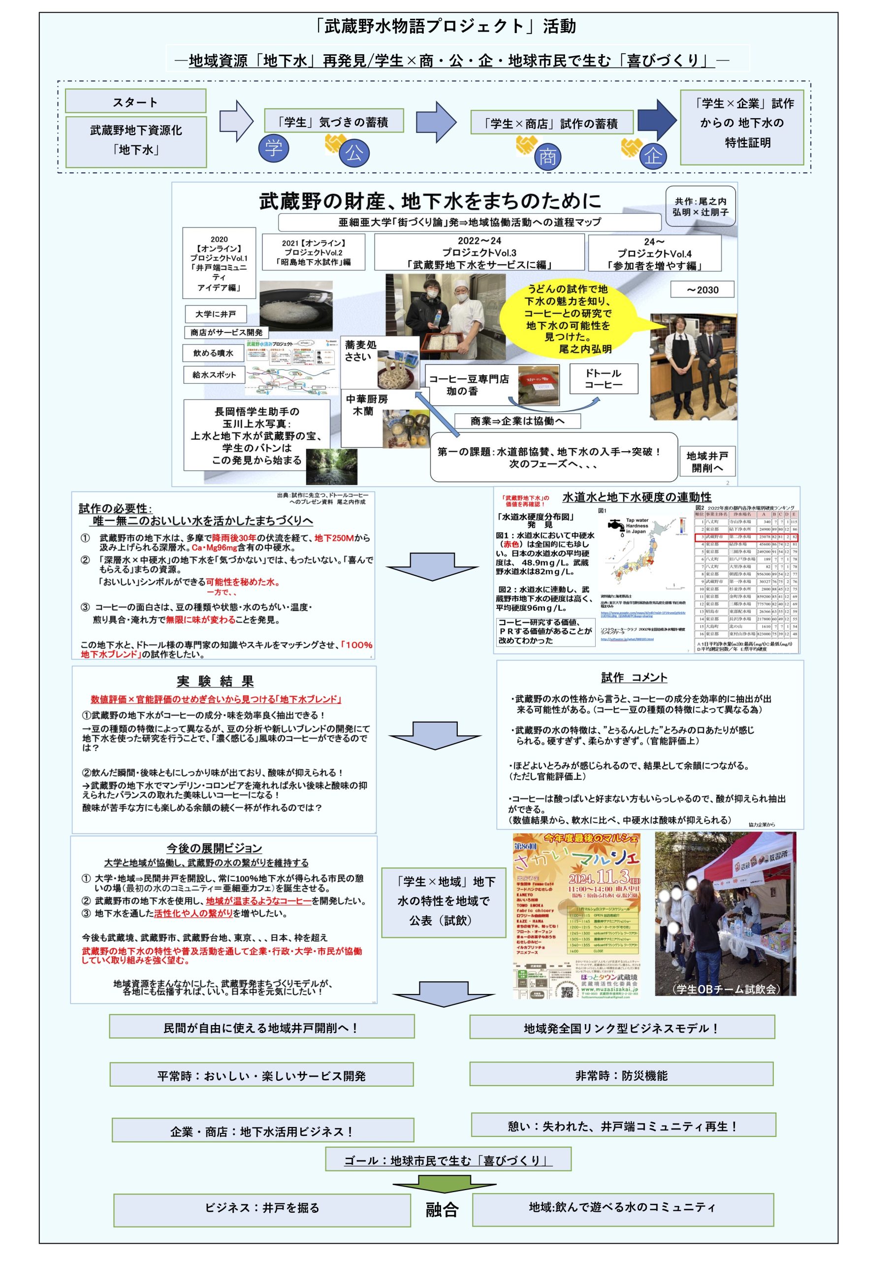 「学生の気づき」バトンをリレー。 武蔵野の財産、地下水を発見。学生×まちの人たちと、喜んでもらえるサービス開発中。 コロナ下の「まちへ飛び出し」禁じ手時代はオンラインで超えた。 共創組織をつくり、誰でも飲んでビジネスも仕事も、防災も、担う民間井戸を 掘りたい。井戸端コミュニティを再生し、無限におもしろくなっていく!!!