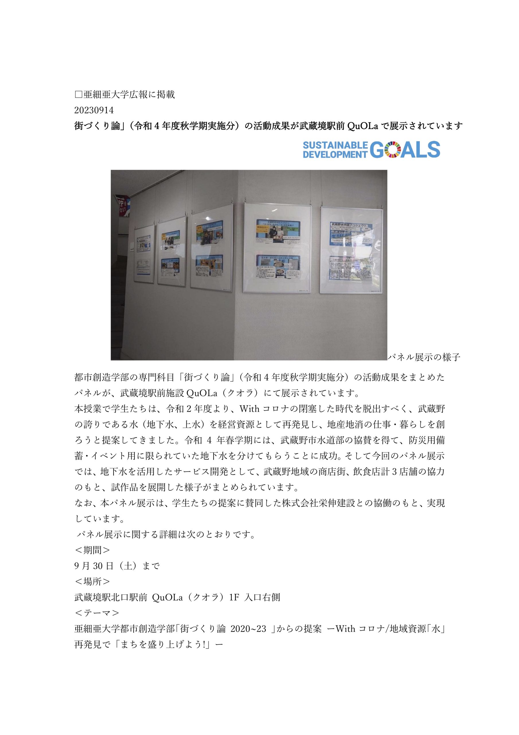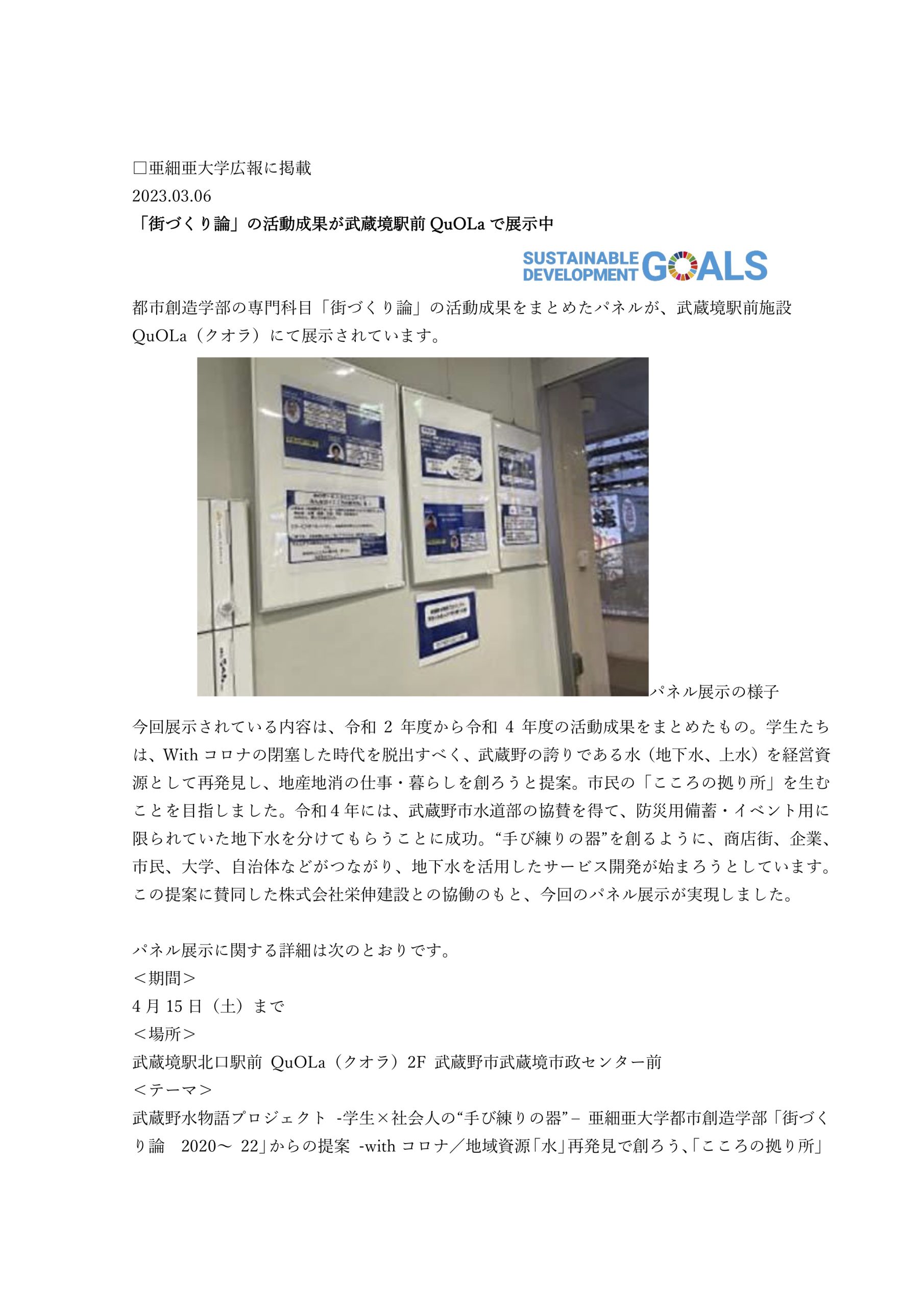 亜細亜大学広報に掲載 1.武蔵野水物語 サービスコミュニティを育む場 2020 2. 「水×α」でつくる「新型コロナ後」サービスコミュニティ 2021 3. 武蔵野水物語プロジェクト「学生×社会人」の手び練りの器 2022 4. 武蔵野水物語プロジェクト 学生×お店の「水・好き」おいしい試作 2023