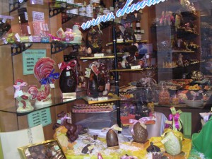 復活祭の季節、まちはたまご型のチョコレートであふれる。お店もお客も気持ちがはずむ。